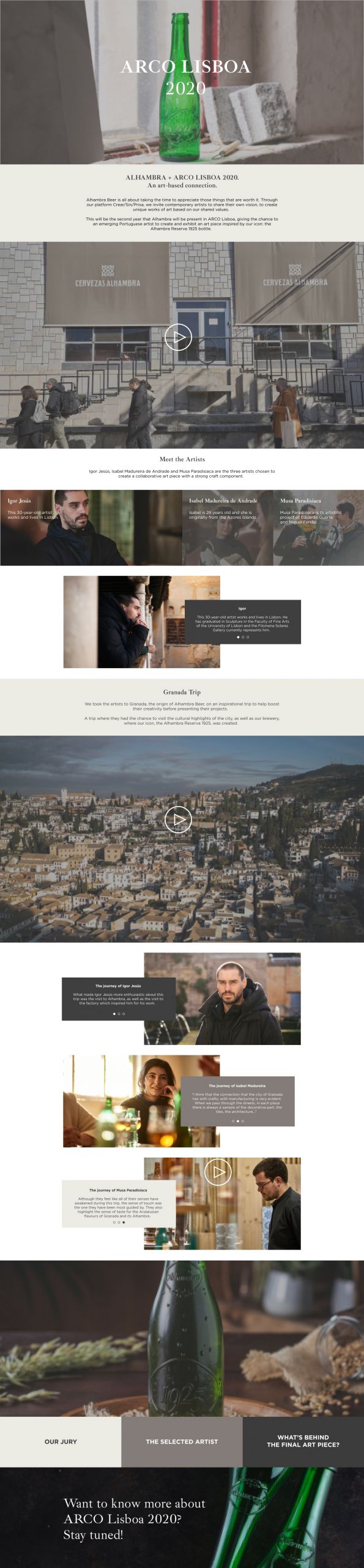 Web realizada para el lanzamiento de Arco 2020 en Portugal donde cinco artistas presentaban sus piezas a concurso con un único ganador. Crear sin Prisa es una iniciativa de la marca para parar a disfrutar del arte inspirado siempre en la esencia de la marca Alhambra.